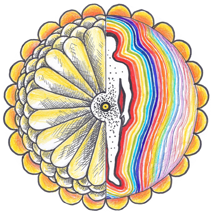 Die Samenkörner der Blume verteilen sich im Menschen, sie spenden ihm Energie auf das er diese Energie an die Natur zurückgeben kann: der äußere Blumenrand.